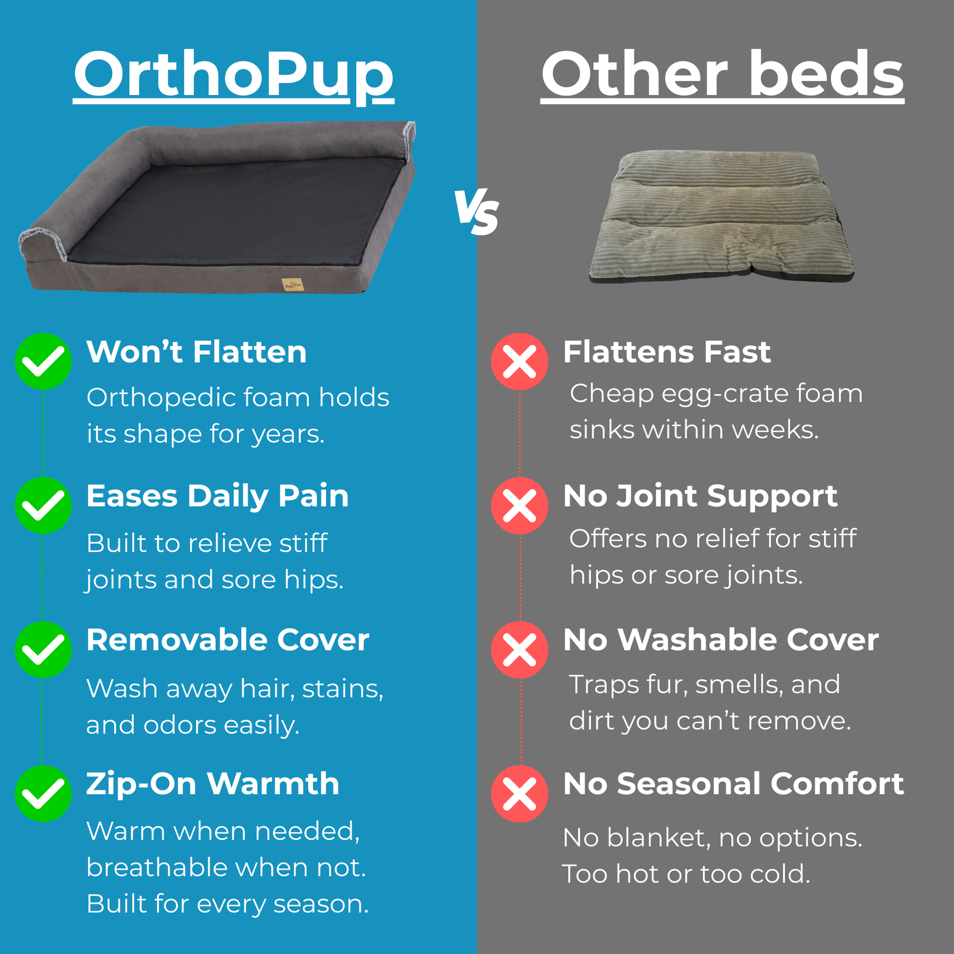 Most standard dog beds feel soft at first but offer little real support. Over time, they flatten out — causing more pain than relief. OrthoPup™ is built to last and specifically engineered to support your dog’s joints, reduce pressure, and improve sleep. It’s not just a bed — it’s a long-term upgrade to their health and comfort.